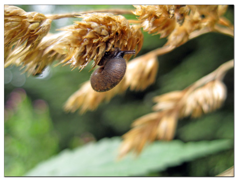 Det kan være en lille snegl på undersiden af et blad.