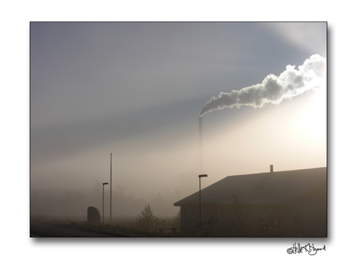 I yderkanten af byen er der udsigt til Rockwools skorsten, den er måske ikke køn, men et anderledes indslag i tågen.