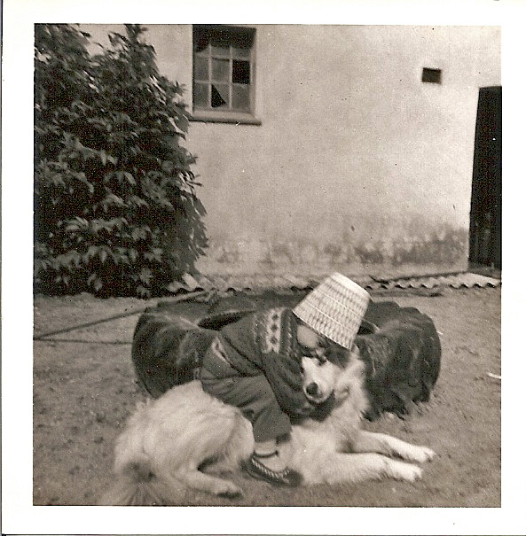 Her sidder jeg på ryggen af min hund Basse, han blev 15 år og var allerede i familien, da jeg blev født. På hovedet har jeg en urtepotteskjuler – yndigt barn 🙂